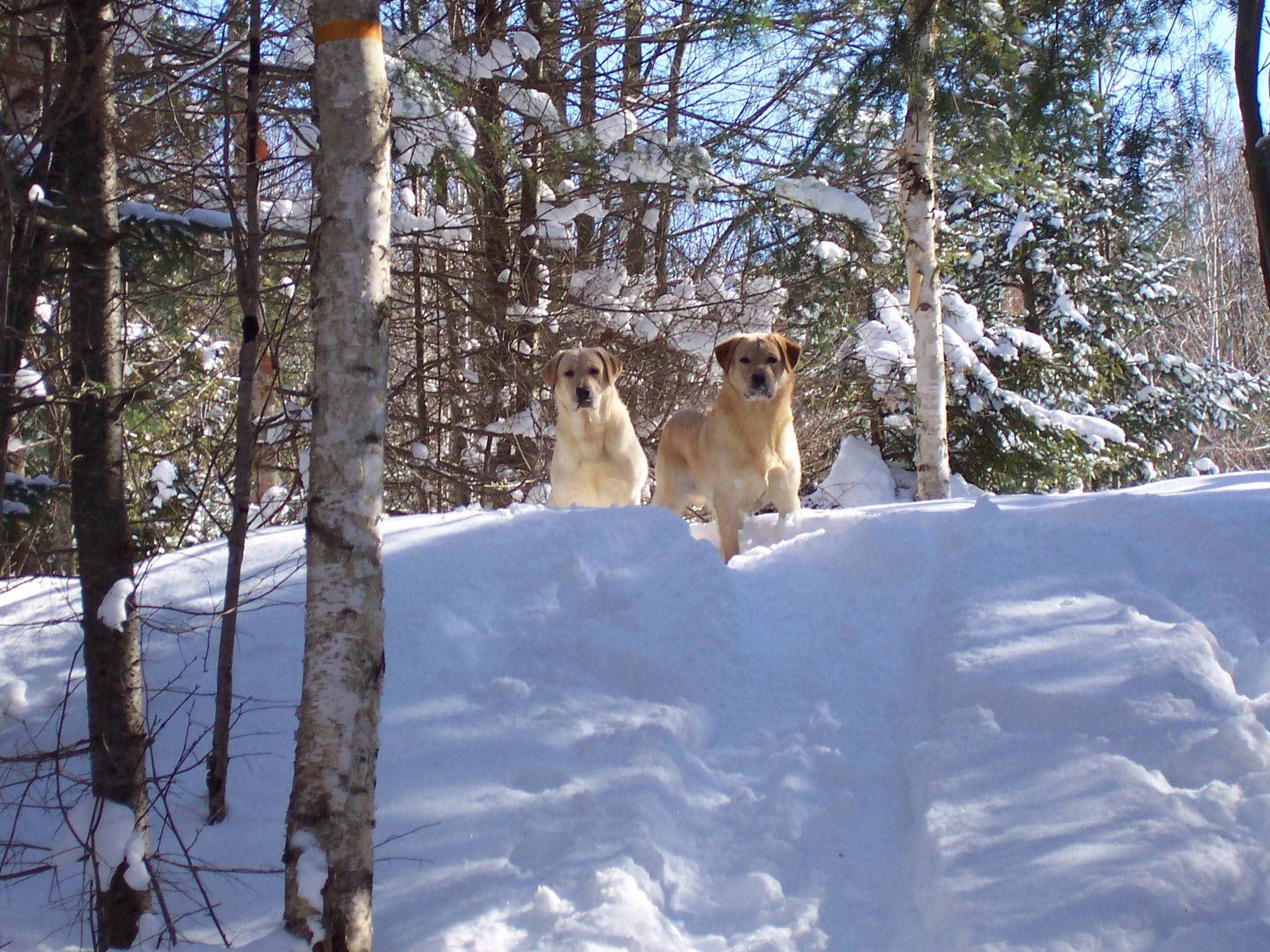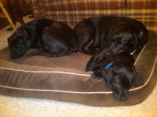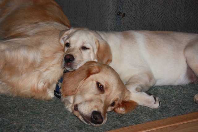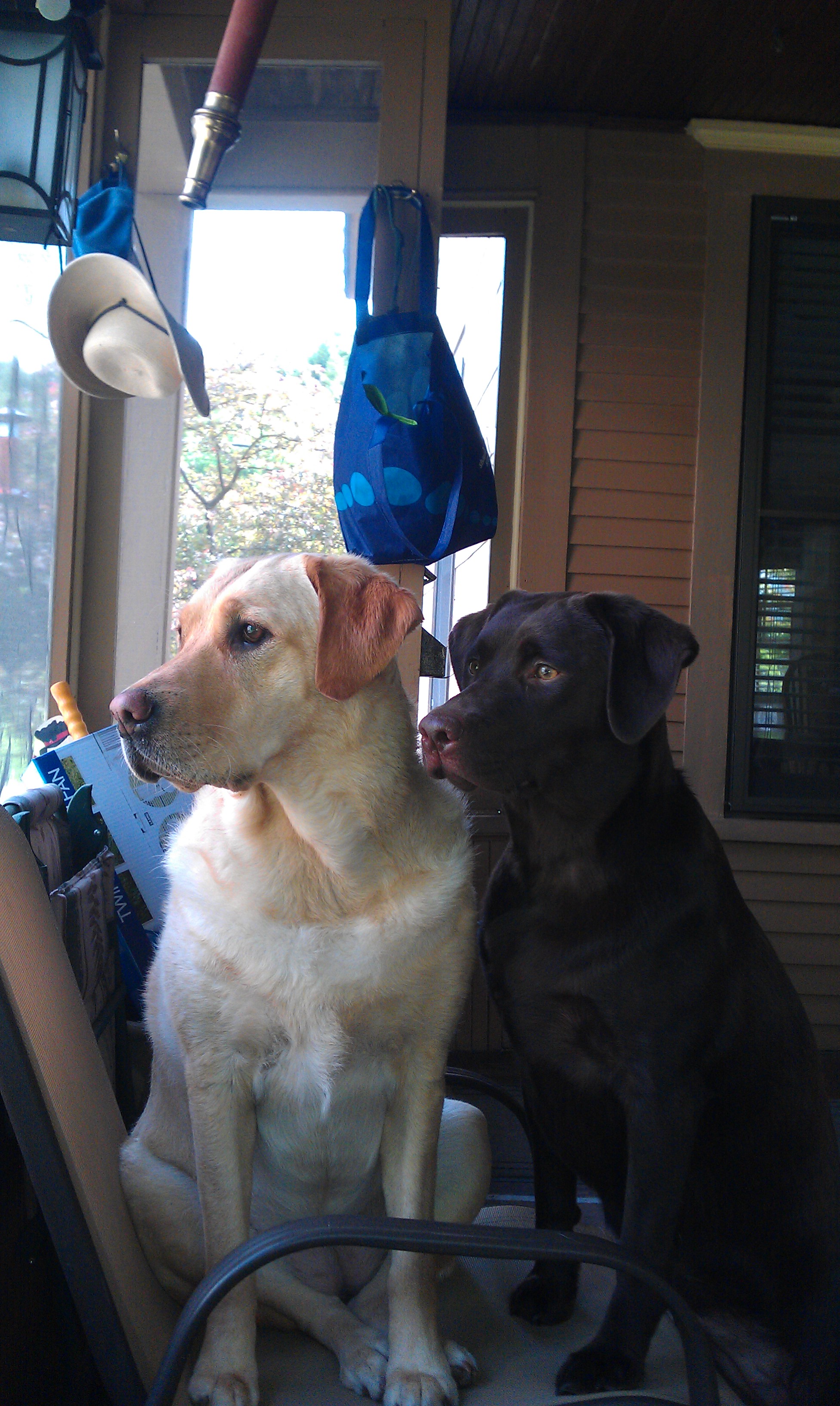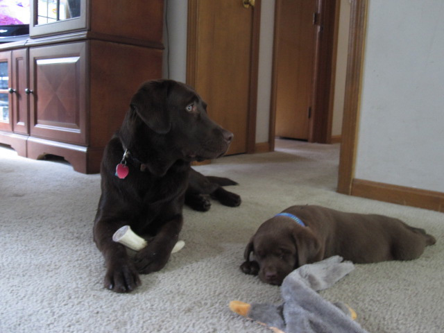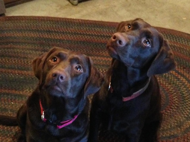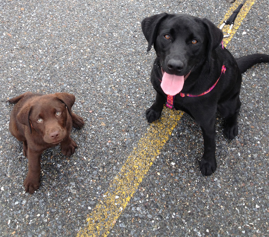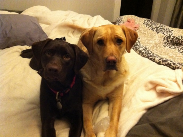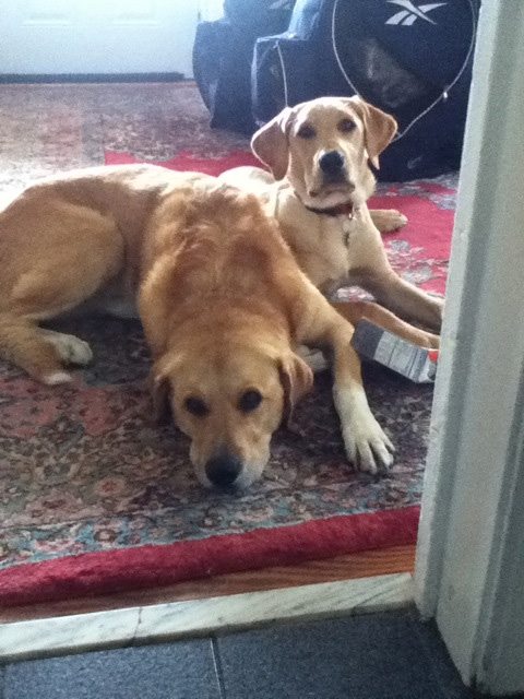 Sully and Bentley the yellow and Chocolate labs.