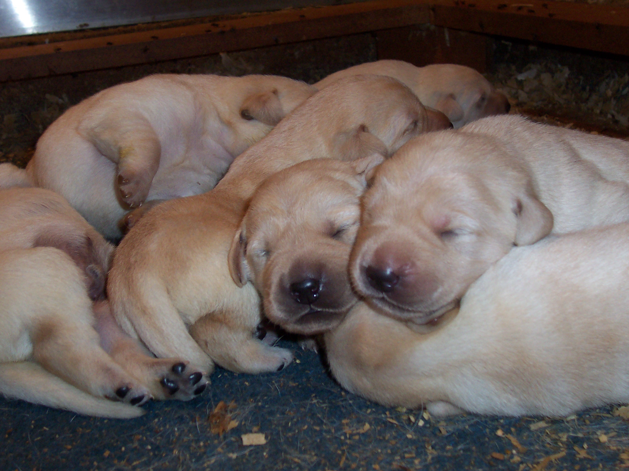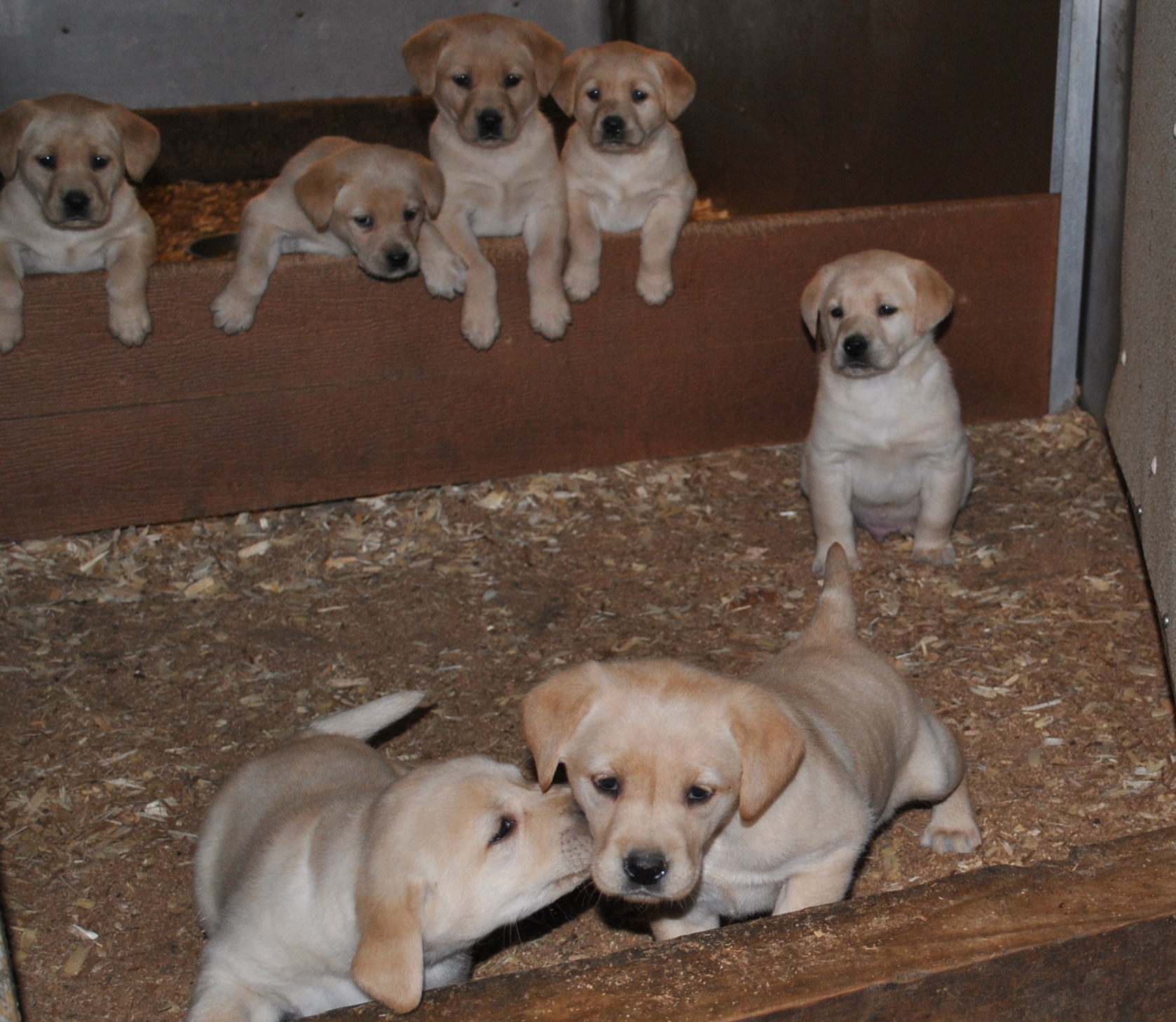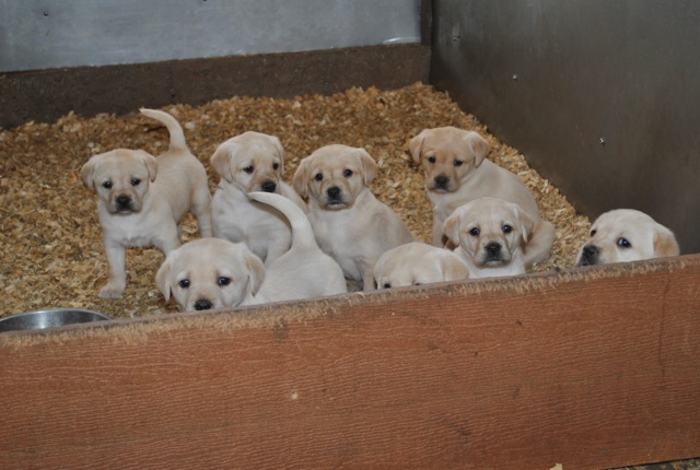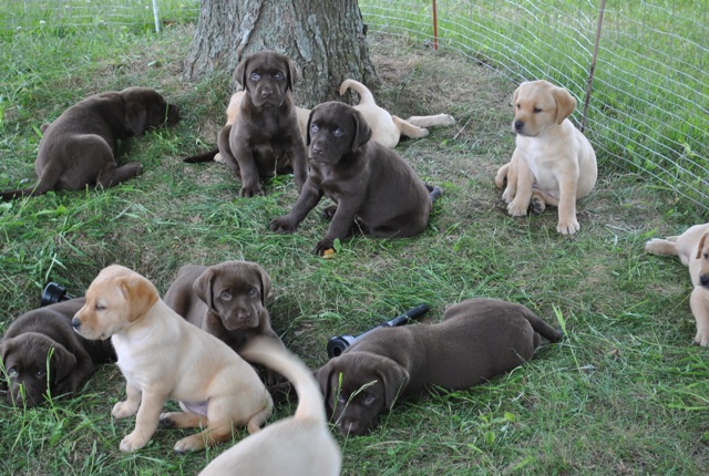 Two litters lounging in a grass pen. Yellows sired by Mr. Jigs; Chocolates Sired by Smoke Jack